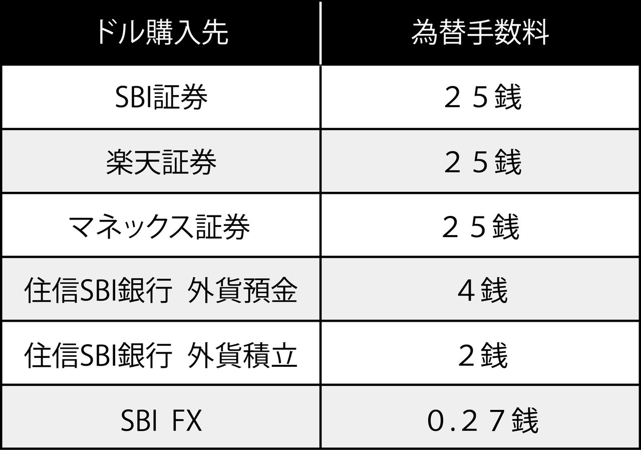 証券会社で円のまま、ドル商品を購入すると、1ドルにつき25銭かかります。