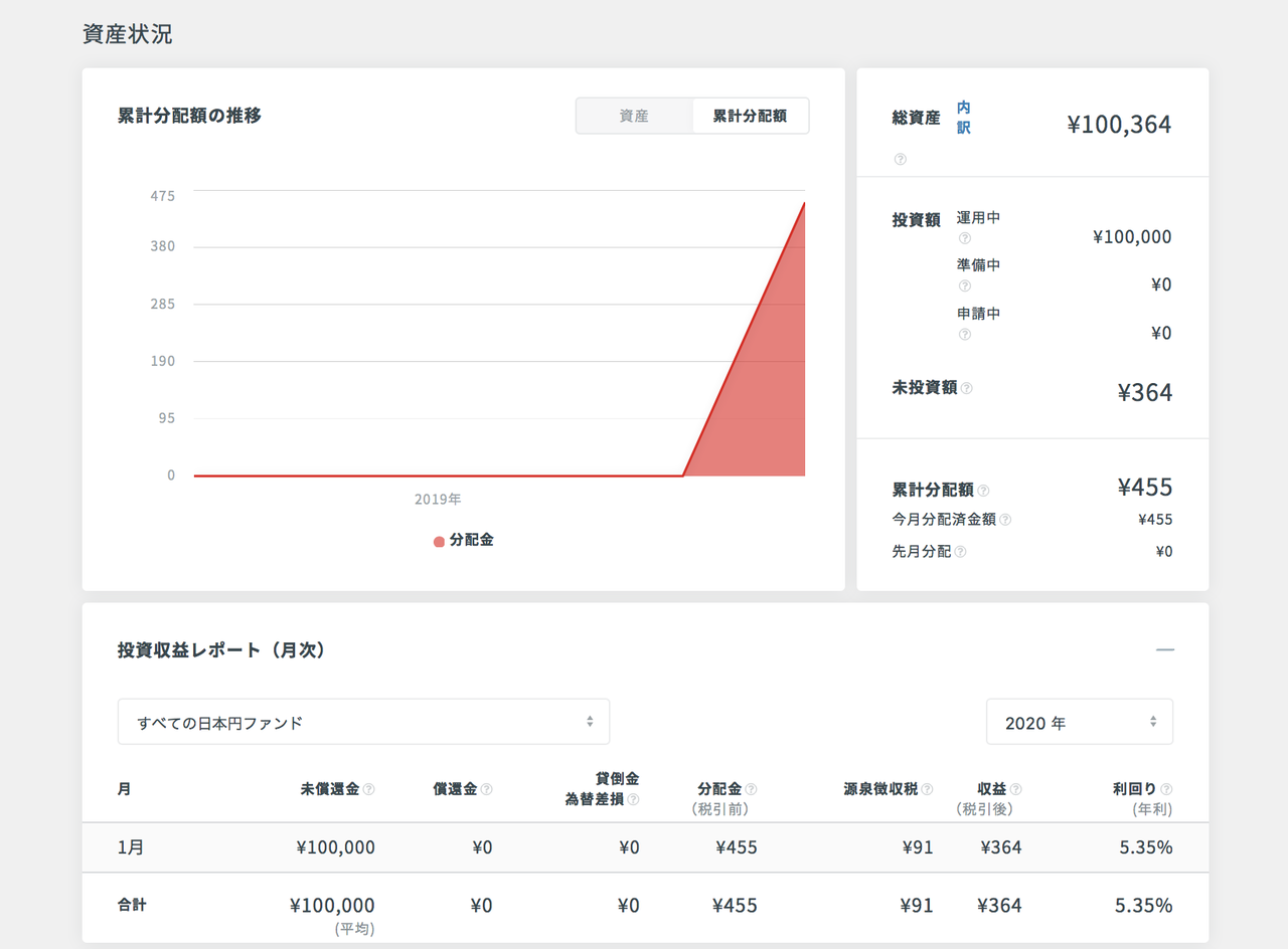 案件が成立し、運用開始されると、翌月からすぐに分配金の支払いが開始されます。